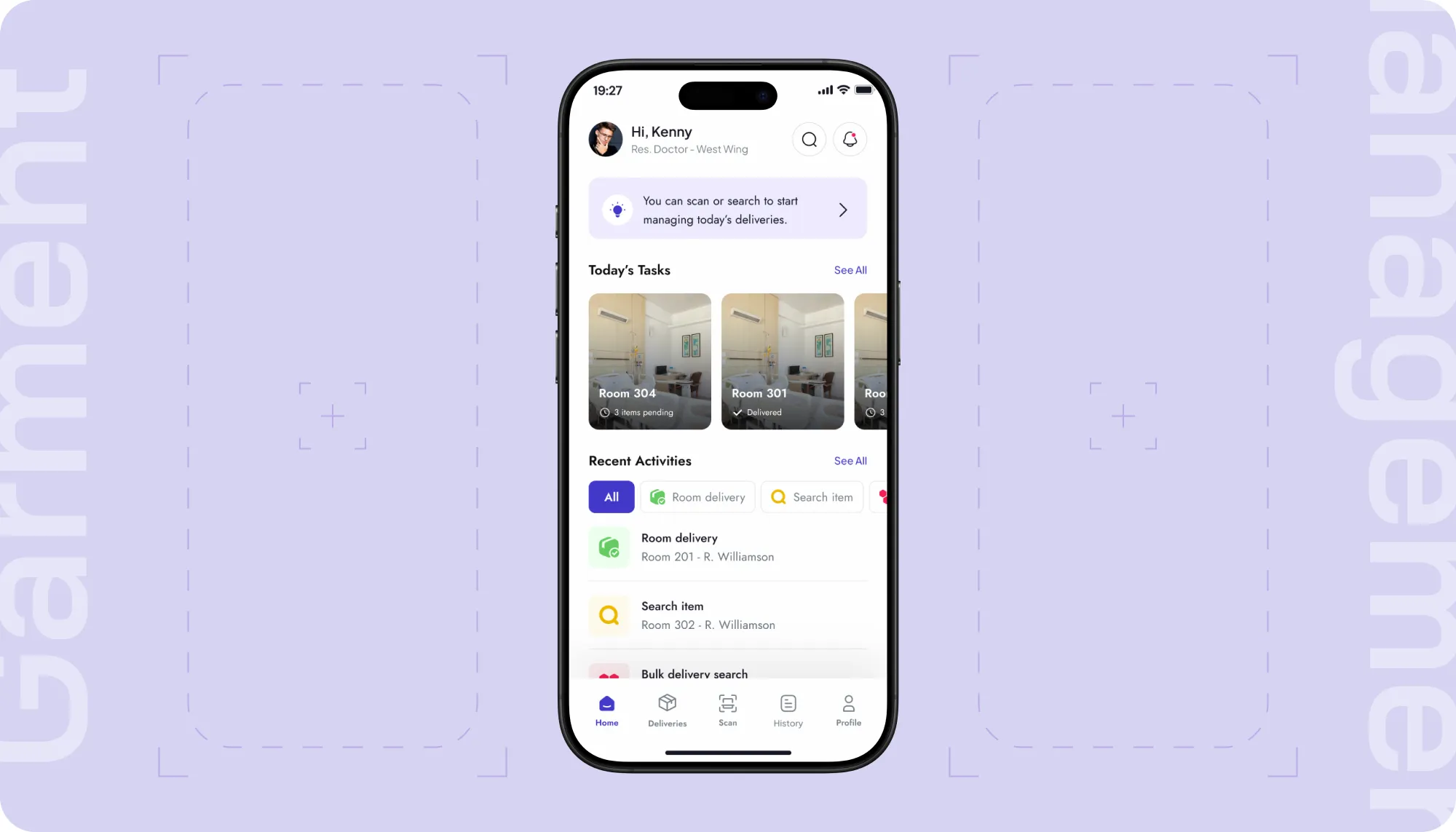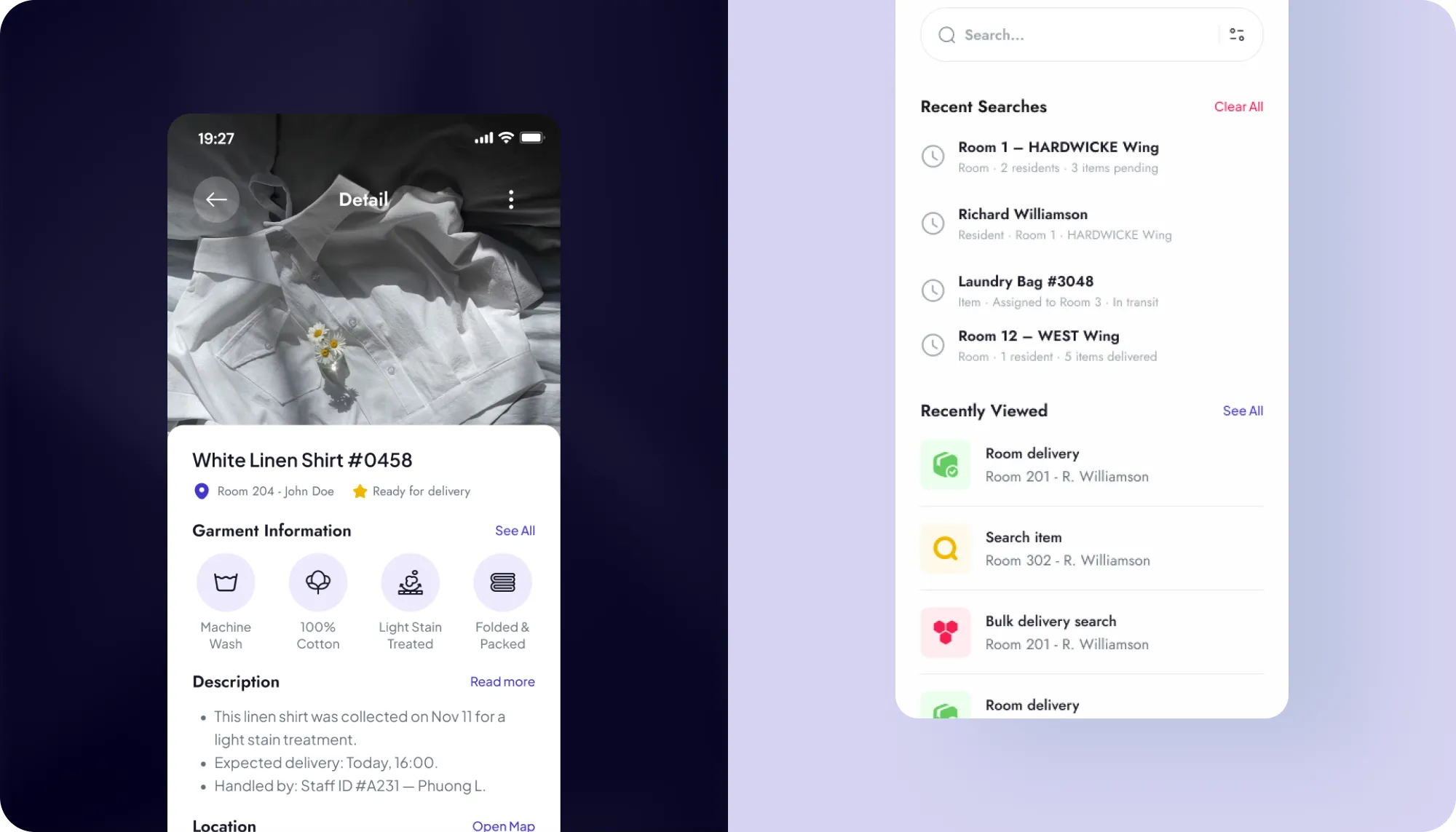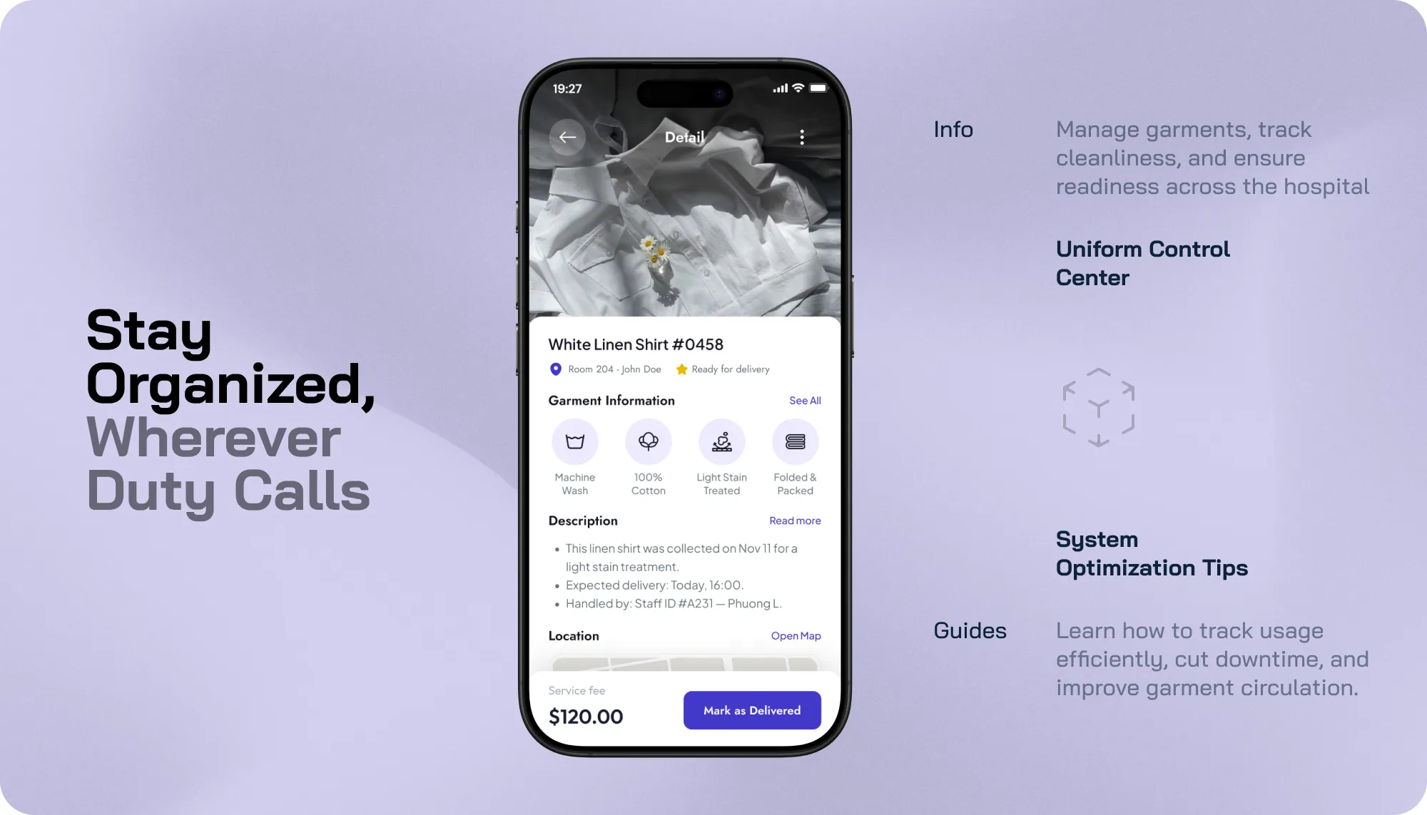 A specialized mobile application designed for managing garments and physical assets in institutional settings using RFID technology. The system provides comprehensive tracking and inventory management capabilities through integration with specialized RFID readers, enabling efficient resource management in large-scale operational environments.